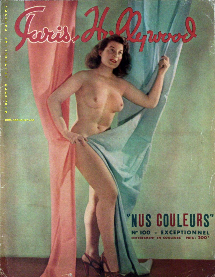 EROTIK.– PARIS HOLLYWOOD.– No. 100 – Exceptionnel. „Nus Couleurs.“ Paris, 1951. Gr. 4°. 28 S. mit farb. Fotografien unbekleideter Frauen. farb. ill. OBr. gutes Ex. EA. The French erotic magazine Paris-Hollywood regularly printed themed issues and you’re looking at the cover of one above, „Nus Couleurs,“ which appeared in 1951. It’s a 28-page collection of color nude photos, shot with typical French panache.