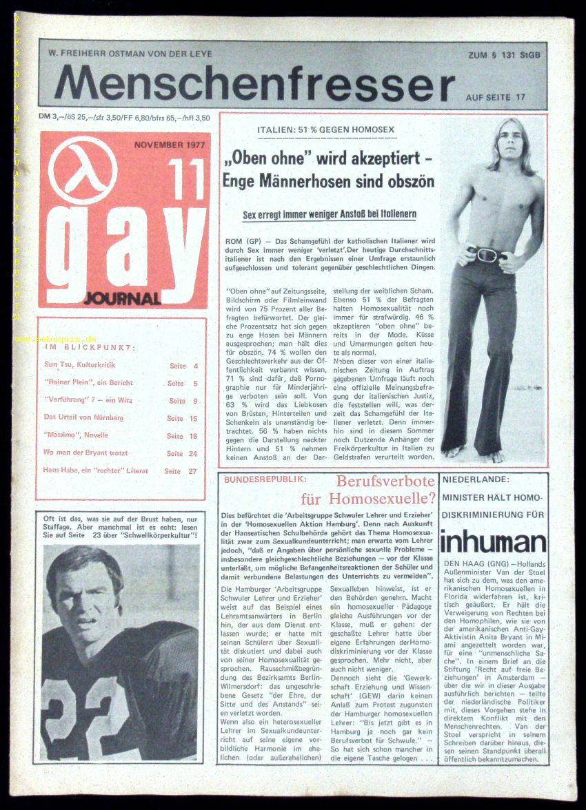 HOMOEROTIK.– GAY JOURNAL. 1977. Heft 11. Das aktuelle Homo-Monatsblatt im neuen Zeitungsformat. Heidelberg (Gassel), November 1977. Fol. 32 S. mit zahlr. Bildern. ill. OBr. gutes Ex. EA.