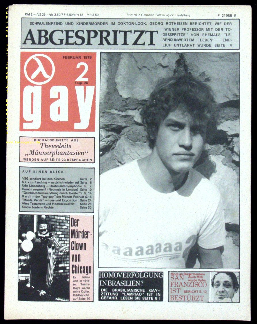 HOMOEROTIK.– GAY JOURNAL. 1979. Heft 02. Das aktuelle Homo-Monatsblatt im neuen Zeitungsformat. Heidelberg (Gassel), Februar 1979. Fol. 32 S. mit zahlr. Bildern. ill. OBr. gutes Ex. EA.