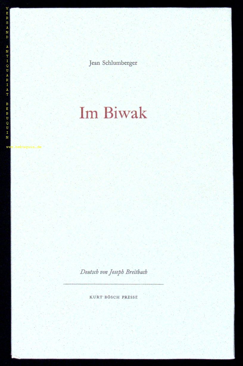 SCHLUMBERGER, Jean: Im Biwak. D.v. Joseph Breitbach. Zürich (Bösch), 1957. 39 S. OBr. tadellos. = Druck der Kurt Bösch Presse, 4. Nr. 69 von 275 nummerierten Ex. miit der eigenhändigen Signatur des Dichters.