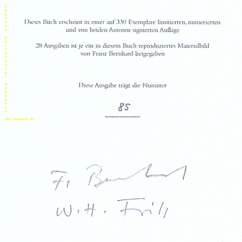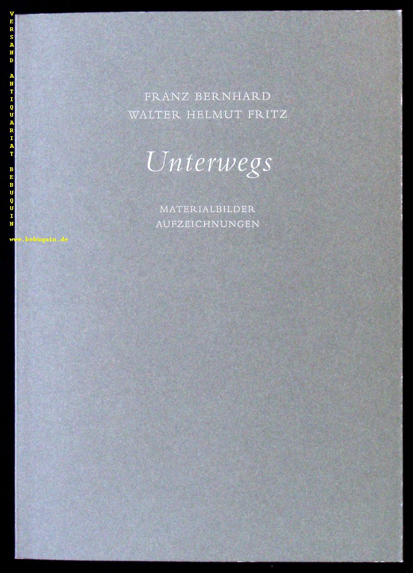 BERNHARD.– FRITZ, Walter Helmut: Unterwegs. Materialbilder, Aufzeichnungen. Stuttgart (Radius), 2003. Gr. 8°. 79 S. mit zahlr. Bildtafeln von Franz Bernhard als Blockbuch gebunden. OKart. tadellos. = Edition Galerie. Nr. 85 von 330 Ex. einer limitiertem, nummerierten und von beiden Autoren eigenhändig signierten Auflage.