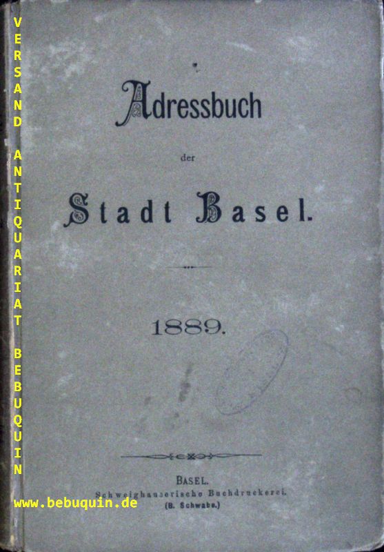 BASEL.– ADRESSBUCH DER STADT BASEL 1889.– Basel (Schwabe), 1889. 398, 16, 74 S. mit zahlr Abb. OPb. Rücken gebräunt, StaT, sonst gutes Ex.