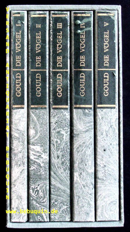 ORNITHOLOGIE.– GOULD, John: Die Vögel Grossbritanniens. Bd. 1 – 5. 5 Bände. Dortmund (Harenberg), 1979. 1 – 5. ca 600 S. mit ca 200 farb. Bildatfeln. marmorierte OPb mit goldgeprägten Lederrückenschildern in OSchuber. Rückenschilder teils etwas berieben, sonst gut erhalten. = Die bibliophilen Taschenbücher. Nr. 202 von 1500 nummerierten Ex.