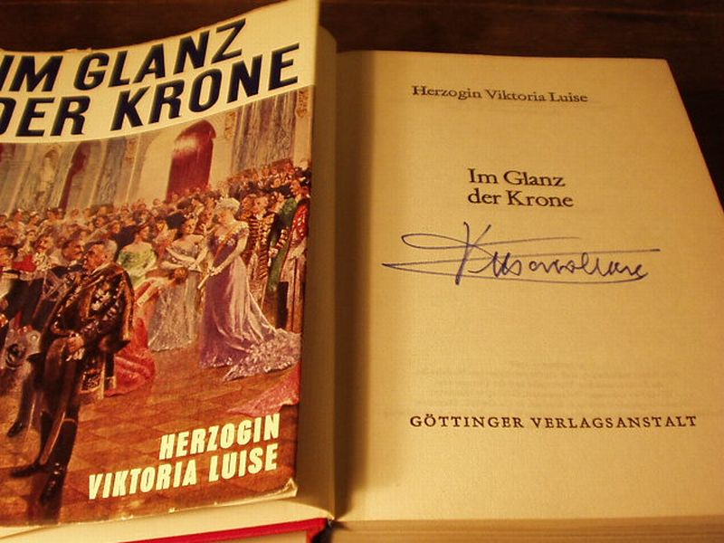 VIKTORIA LUISE, Herzogin: Im Glanz der Krone. Göttingen (Verlagsanstalt), 1968. Gr. 8°. 369 S. mit hunderten von Bildern. OLn mit OUmschl. Umschlag etwas lädiert. mit der eigenhändigen Signatur der Autorin auf Titelseite.