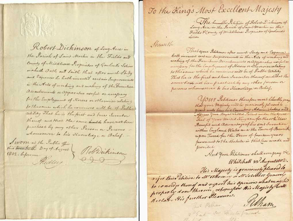 PELHAM, Thomas, Earl of Chichester (1756–1826), Innenminister.– Eigenhändiger Patentantrag betreffend eine veterinärmedizinische Erfindung, Pferdehaltung betreffend, von Robert DICKINSON. Hierauf der ausführliche Bearbeitungsvermerk des Innenministers mit dessen eigenhändiger Signatur. London, 20.08.1802 32 x 19 cm. 3 S. auf Doppelbogen Hadernbütten mit Wasserzeichen königliches Wappen und mit Bearbeitungsvermerk und 2 hohlgeprägten Steuermarken. mittig gefaltet. PELHAM signiert als konservativer Innenmnister (1801-1803) einen Bearbeitungsvermerk. Er war Mitglied des Kabinetts Addington, das 1802 den Frieden von Amiens mit Napoleon schloß. Er war damit Gegner Pitts, der den Krieg mit Napoleon wieder aufnahm.