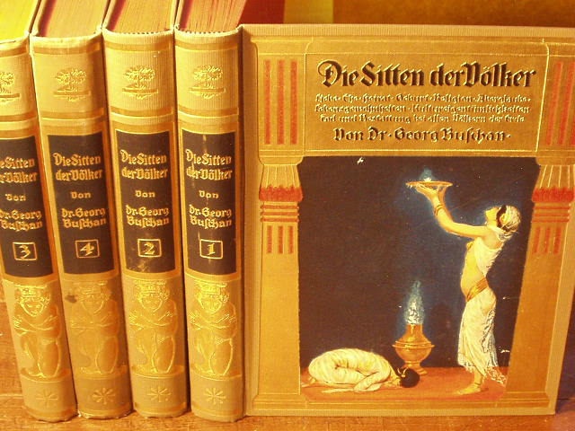 BUSCHAN, Georg: Die Sitten der Völker. Liebe – Ehe – Heirat – Geburt – Religion – Aberglaube – Lebensgewohnheiten – Kultueigentümlichkeiten. Tod und Bestattung bei allen Völkern der Welt. 4 Bände. Stuttgart (Union), 1915 ff. 4°. VIII, 432 (IV), 459, 1, IV, 444, VIII, 462, 2 Seiten mit zahlr. teils ganzseitigen teils farb. Abb. und Bildtafeln. farb. ill. OLn mit reicher Deckel- und Rückenvergoldung, dreiseitigem Rotschnitt. Kapitale etwas bestoßen, vereinzelt Kratzspuren, insgesamt schönes Ex. Bd. 1: Australien und Ozeanien. Asien mit 500 Textabb, 11 farb. Kunstbeilagen – 12 Kunstblättern in Doppeltondruck. Bd. 2: Asien. Afrika. Mit 522 Textabb. 11 farb. Kunstbeilagen und 12 Kunstblättern. Bd. 3: Afrika. Amerika. Europa. Mit 477 Textabb, 6 farb. Kunstbeilagen und 9 Kunstblättern. Bd. 4: Das Deutsche Volk in Sitte und Brauch. Mit 353 Textabb. 4 farb. Kunstbeilagen und 11 Kunstblättern.