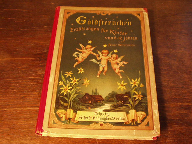 WIEDEMANN, Franz: Goldsternchen. Kleine moralische Erzählungen für KInder von 6 bis 12 jahren. 7. Aufl. Leipzig (Oehmigke), ca 1900. 4°. 148 S. mit 4 farblithographischen Bildtafeln. farb. ill. OHLn mit drei Engeln am Nachthimmel. Kanten nur gering berieben, schönes Ex. vergl. Seebaß 2186.
