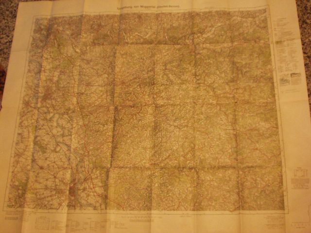 WUPPERTAL.– UMGEBUNGSKARTE VON WUPPERTAL (ELBERFELD – BARMEN).– Hrsg. vom Reichsamt für Landesaufnahme. Zusammendruck aus der Übersichtskarte von Mitteleuropa von 1940. 1:100000. Berlin, 1940. ca 100 x 110 cm. In 3 Farben. Ecken gering bestoßen, sonst gut erhalten.