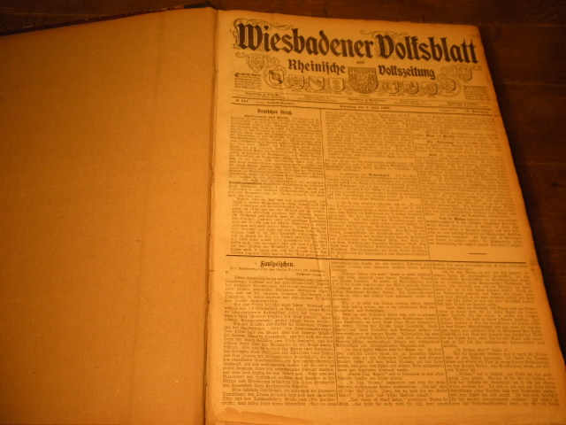 WIESBADENER VOLKSBLATT.– Rheinische Volkszeitung. 15. Jahrgang. No 147 – No 297 in 1 Band. Wiebaden, 1902. 45 x 32 cm. ca 1000 S. mit umfangreichem Werbeteil. HLn der Zeit. Etwass bestaubt, Papier altersbdeingt gebräunt, insgesamt sehr gut erhalten. 2. Halbjahresband der Tageszeitung.