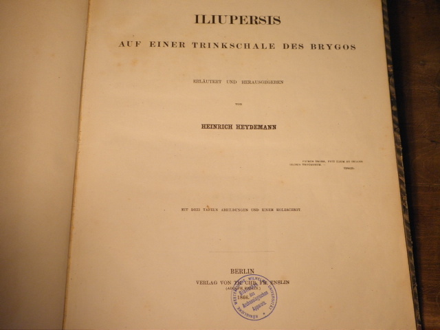 ANTIKE.– HEYDEMANN, Heinrich: (Hrsg.) Iliupersis auf einer Trinkschale des Brygos. Berlin (Enslin), 1866. Fol. 37 S. mit Holzschnittill. + 3 lithographieschen Bildtafeln. HLn der Zeit. Bibliotheksexemplar, einige Stockflecken. seltene EA.