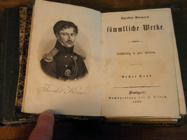 KÖRNER, Theodor: Sämmtliche Werke. Vollständig in 2 Bänden. Stuttgart (Ullrich), 1848. 12°. VIII, 376, 372 S. mit gestochem Portrait als Frontispiz. HLn der Zeit mit goldgeprägtem Rücken. Vorsätze gebräunt, sonst gut.