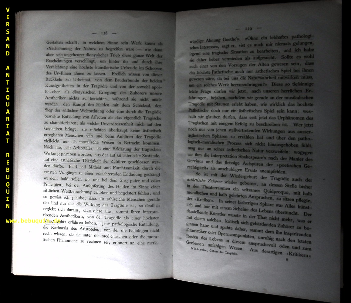 NIETZSCHE, Friedrich: Die Geburt der Tragödie aus dem Geiste der Musik. Leipzig (Fritzsch), 1872. Gr. 8°. IV, 143 S. mit Titelvignette. Mod. Pb mit Rückenschild. erste Seiten mit kleinem Braunrand, im Text teils mit Bleistiftunterstreichungen, insgesamt sehr gut machbar. Erste Ausgabe des Erstlings des wohl bedeutendsten deutschen Philosophen WG² 1; Borst 3167; Jacoby 50. – Mit Vorwort an Richard Wagner. Nietzsches erstes philosophisches Werk, das er 1869 in Basel begonnen hatte, steht noch ganz im Bann Richard Wagners: „…vergegenwärtige ich mir den Augenblick, in dem Sie, mein hochverehrter Freund, diese Schrift empfangen werden: wie Sie, vielleicht nach einer abendlichen Wanderung im Winterschnee, den entfesselten Prometheus auf dem Titelblatte betrachten… und sofort überzeugt sind, dass … der Verfasser etwas Ernstes und Eindringliches zu sagen hat“ (Vorwort an R. Wagner).