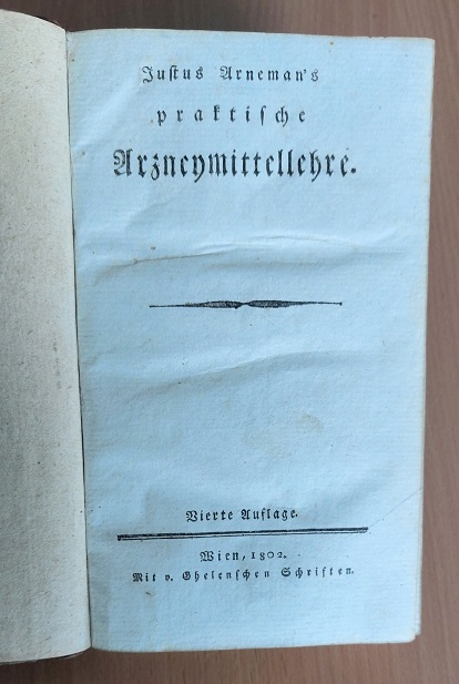 MEDIZIN.– ARNEMAN, Justus: Praktische Arzneymittellehre. 4. Aufl. Wien (Gehlen), 1802. XII, 422 S., 13 Bl. HLdr der Zeit mit goldgeprägtem Rücken. gutes Ex. Hirsch-Hüb. I, 572. – J. Arnemann (1763-1806) war seit 1787 Professor an der medizinischen Fakultät in Göttingen. – „Mit besonderer Vorliebe hat A. die Chirurgie betrieben; von seinen litterarischen Leistungen auf diesem Gebiete sind seine „Bemerkungen über die Durchbohrung des proc. mastoid. in gewissen Fällen der Taubheit.“ Göttingen 1792 und die für seine Vorlesungen bestimmten Lehrbücher „Uebersicht der berühmtesten und gebräuchlichsten chirurg. Instrumente etc.“ Gött. 1796 (sehr vollständig) und „System der Chirurgie“ 2 Bde. eb. 1798—1801 (ein seiner Zeit sehr geschätztes Handbuch) zu nennen; außerdem hat A. zwei Lehrbücher der praktischen und chirurgischen Arzneimittellehre (beide in zahlreichen Auflagen) und ein (nicht vollendetes) „Handbuch der praktischen Medicin“ (Gött. 1800.) veröffentlicht und während seines Aufenthalts in Göttingen ein „Magazin für die Wundarzneiwissenschaft“ (in 11 Heften) herausgegeben“ (A. Hirsch in ADB I, 553 f.).