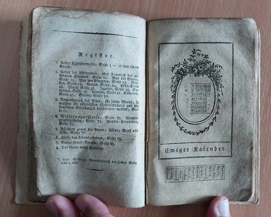 KALENDER.– DREYSSIG: Hundertjähriger Kalender beim Kunsthändler Dreyssig zu haben. + Ewiger Kalender. 2. Aufl. des Kalenders für die Jahre 1801 – 1900. 2 Bände in 1 Bd. Halle (Dreyssig), ca 1800. kl. 8°. 92 S. mit gestochenem kolorierten Frontispiz und gestochenem kolorierten Kupfertitel sowie einige kleinen Holzschnitten sowie 72 S. mit gestochenem Titelblatt und Kopfvignetten. Pb der Zeit mit neurem Leinenrücken. innen teils stärker fleckig und wasserandig. Der 100-jährige Kalende ist ein traditioneller Wetterkalender, der auf alten Wetterbeobachtungen und astrologischen Vorhersagen basiert. Er soll Wetterveränderungen vorhersagen, was besonders in der Landwirtschaft hilfreich sein kann.
