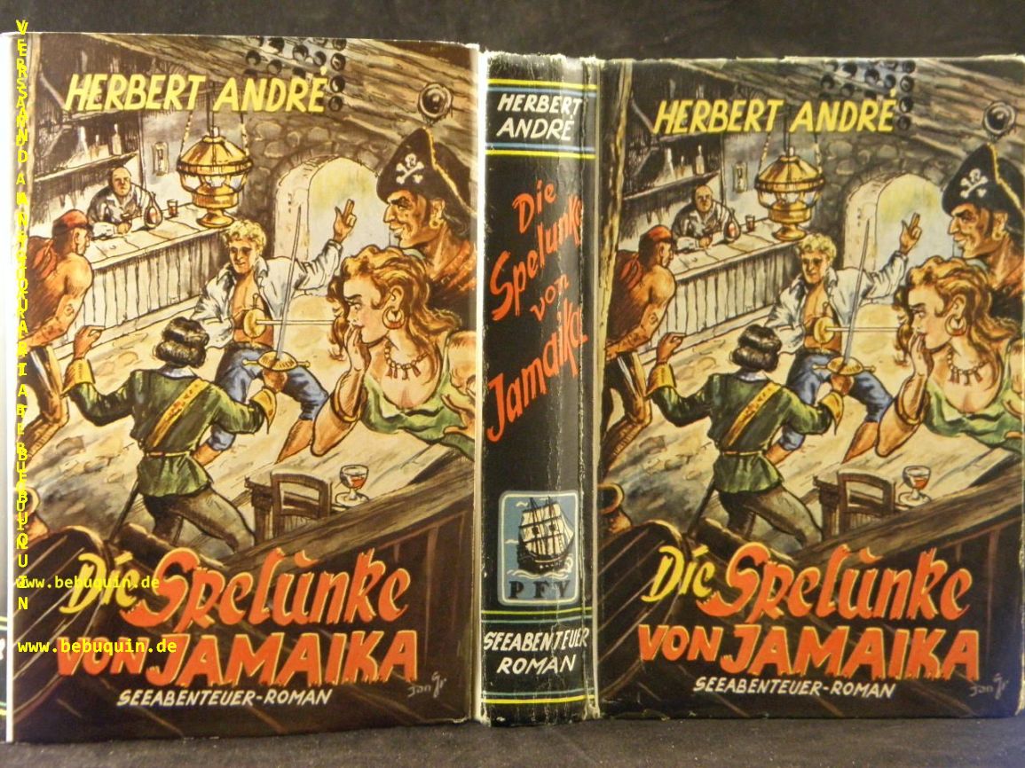 ANDRE, Herbert: Die Spelunke von Jamaica.. Seeabenteuer-Roman. Marl-Hüls (Feldmann), ca 1950. 271 S. farb. ill. OPb. mit 3 OUmschl. fliegender Vorsatz fehlt, Rücken mit Knickspur. 1. Aufl. dieser Ausgabe.