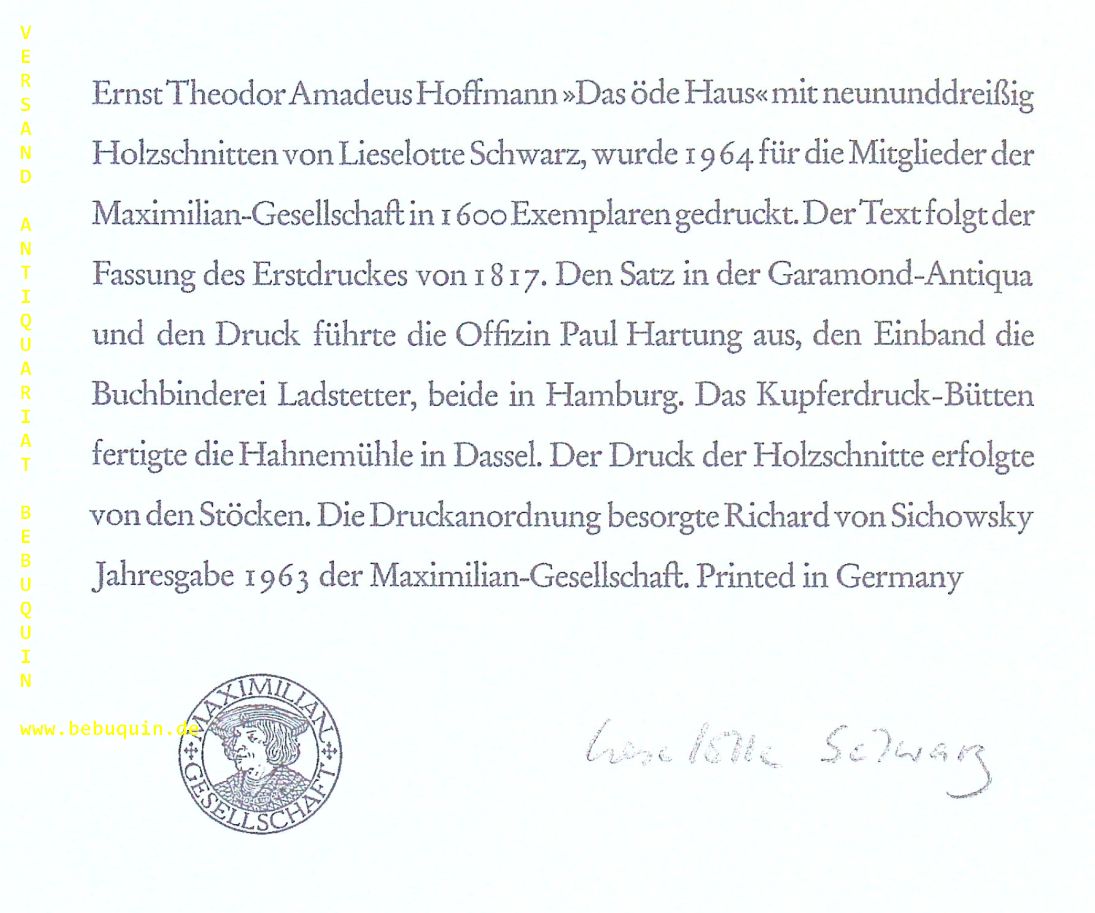SCHWARZ.– HOFFMANN, E. T. A.: Das öde Haus. Hamburg )Maximilian-Ges.), 1964. 4°. 79 S. mit 39 Holzschnitten von Lieselotte Schwarz. ill. OPb mit OUmschl. tadellos. = Jahresgabe der Maximilian-Gesellschaft in Hamburg, 1963. 1 von 1600 Ex. mit der Signatur der Künstlerin am Druclvermerk.