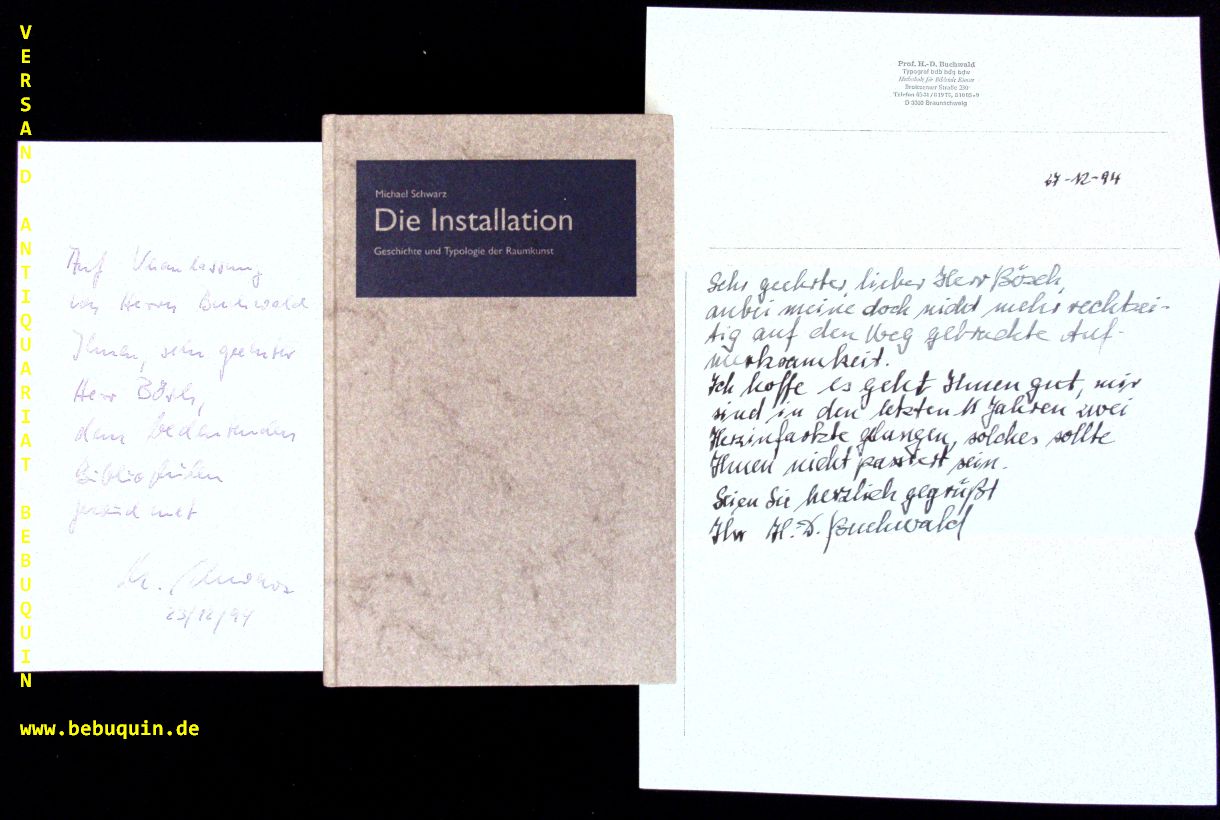 SCHWARZ, Michael: Die Installation. Geschichte und Typologie der Raumkunst. Braunschweig (Leporello); 1994. 88 S. mit zahlr. Abb. OPb. tadellos. seltene EA mit einem eigenhändigen signierten und datierten Brief des Verfassers inliegend sowie ein weiterer eigenhändiger Brief des Prof. Hans Dieter Buchwald dabei.