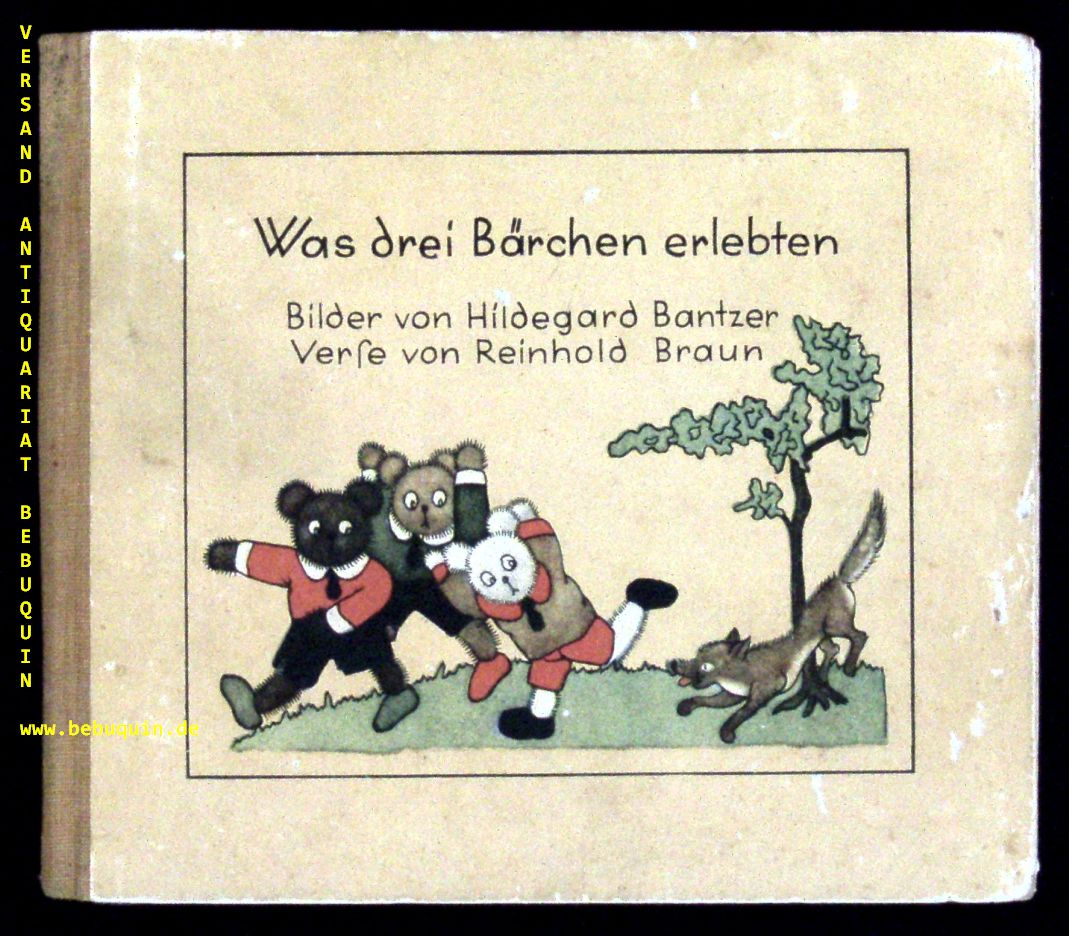 BANTZER.– BRAUN, Reinhold: Was drei Bärchen erlebten. Chemnitz (Max Müller), 1929. 13,5 x 15,5 cm. 23 S. mit 11 farb. Bildtafeln von Hildegard Bantzer. farb. ill. OHLn. ausgebunden, sonst gutes Ex. EA in einer größeren Ausgabe mit 2 Seiten Verlagswerbung am Ende. Klotz 655/1.
