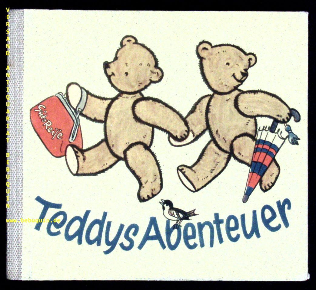 TEDDYS ABENTEUER.– Ein lustiges Bilderbuch für unsere Kleinen. Calbe (MDV), 1949. Quer 8°. 12 S. mit 11 farb. Bildtafeln. farb. ill. OHLn. feines Ex. EA Mück 6076.