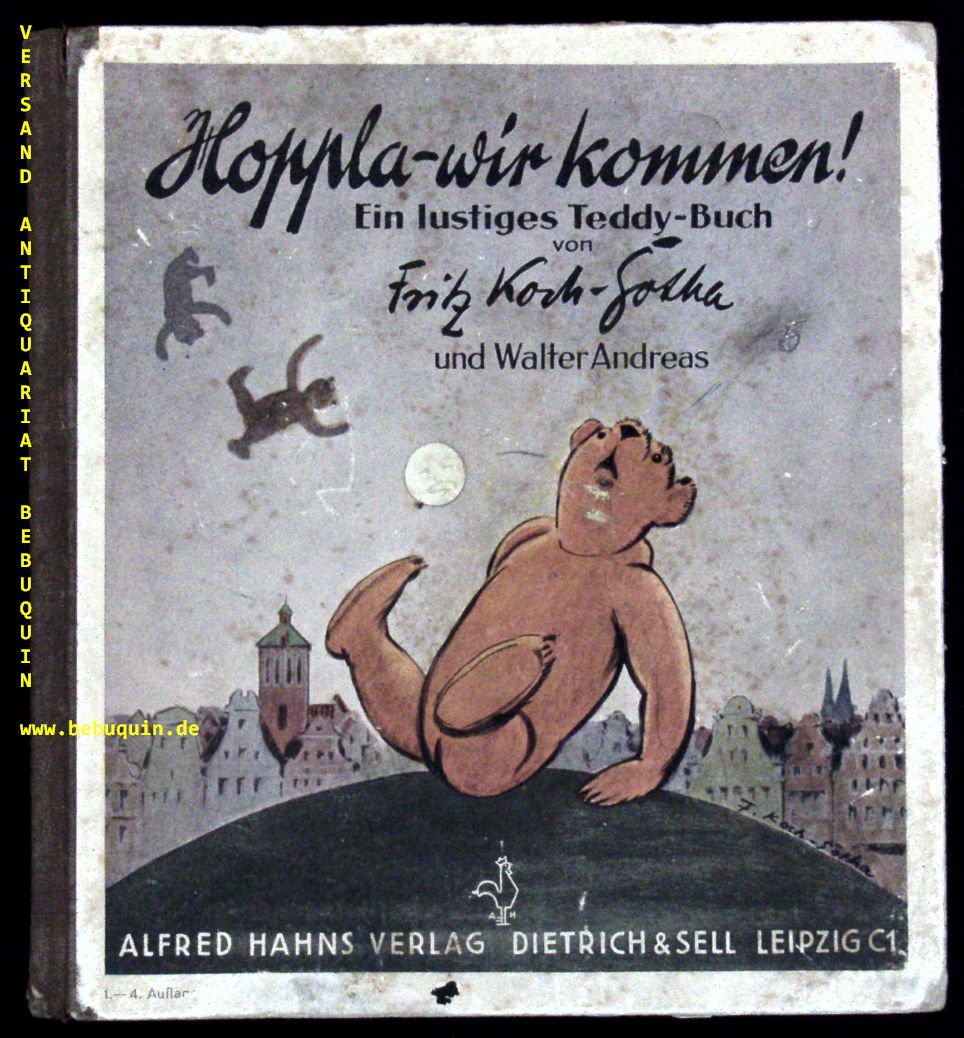 KOCH-GOTHA.– ANDREAS, Walter: Hoppla – wir kommen! Ein lustiges Teddy-Buch. Leipzig (Hahn), 1931. Gr. 8°. 15 Bl. mit 15 farb. Bildtafeln und zahlr. Textabb. von Fritz Koch-Gotha. farb. ill. OHLn. Einband etws angeschmutzt, innen an einer Ecke leicht gelöst, insgesamt noch gut. EA.