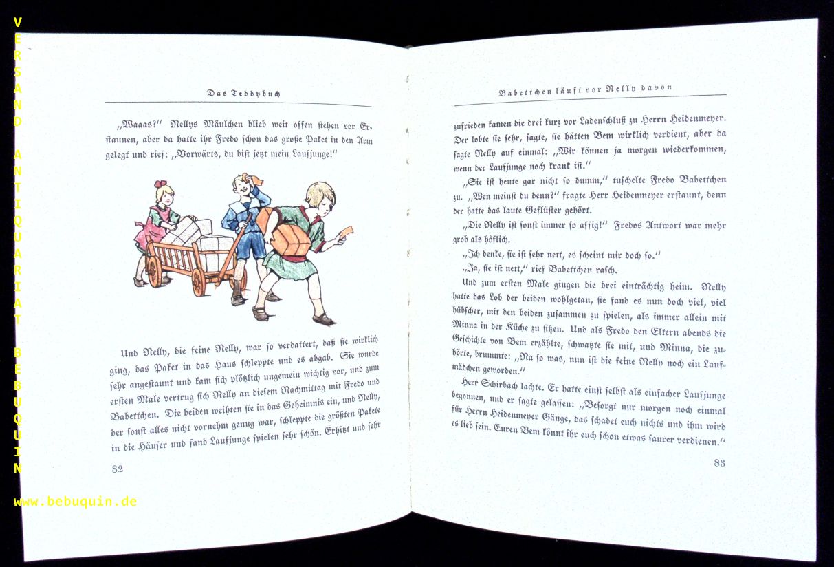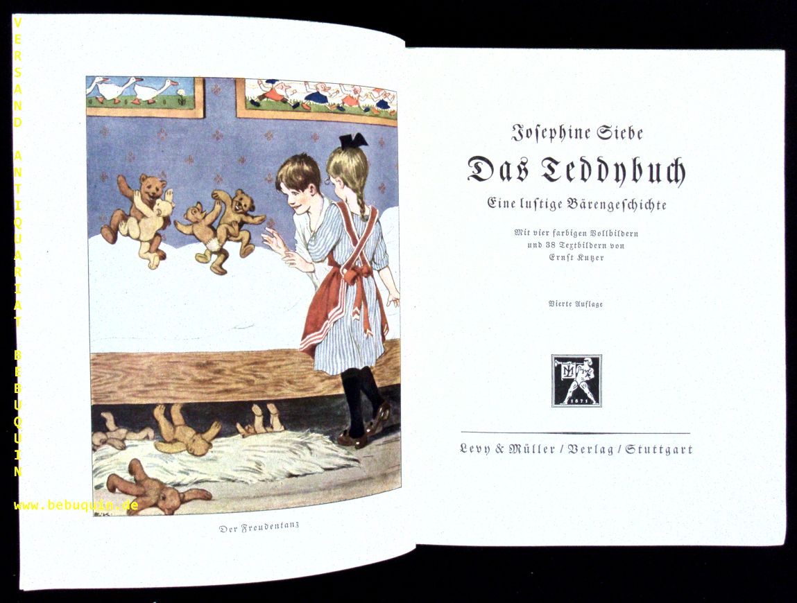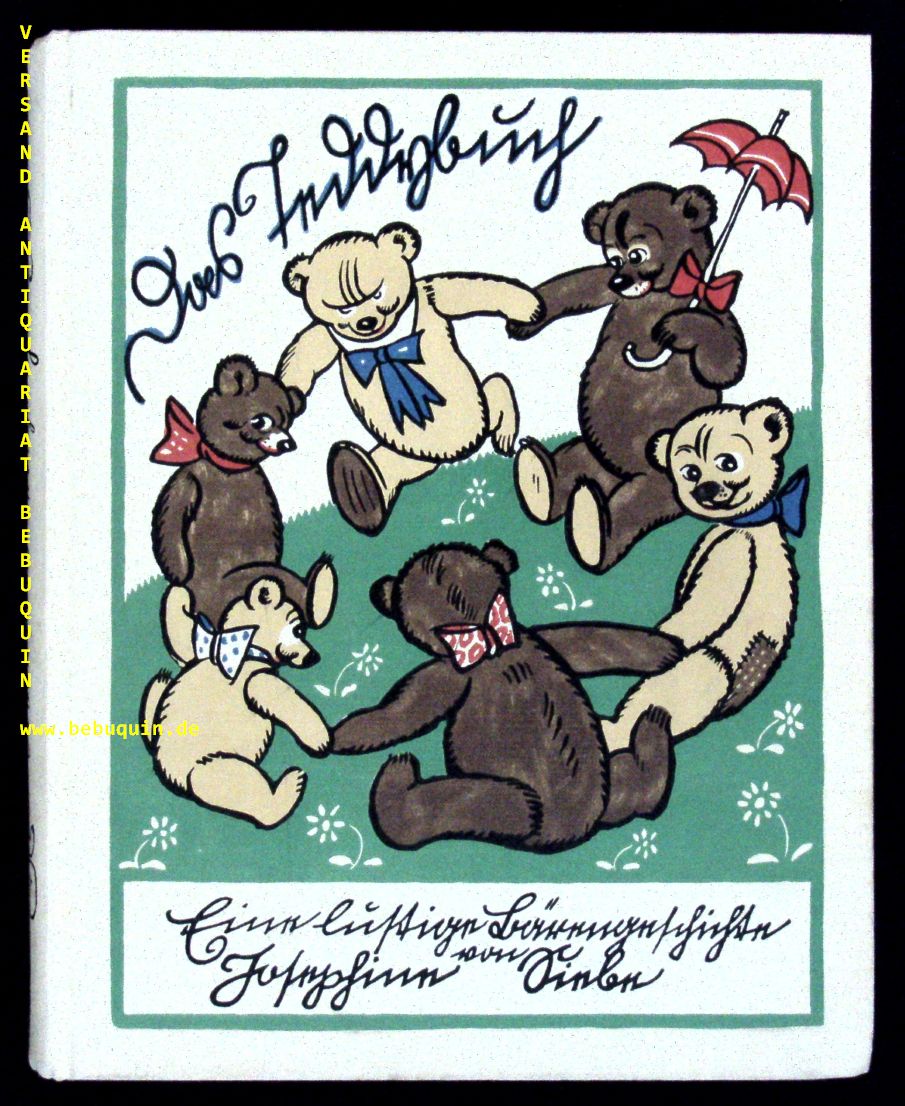 SIEBE, Josephine: Das Teddybuch. Eine lustige Bärengeschichte. 4. Aufl. Stuttgart (Levy & Müller), 1924. Gr. 8°. 173 S. mit zahlr. Textabb. + 4 Farbtafeln von Ernst Kutzer. ill. OLn. alle Textabb. von Kinderhand fein koloriert, sehr fein erhaltenes Ex. seltene frühe Ausgabe. Klotz 6789/113.