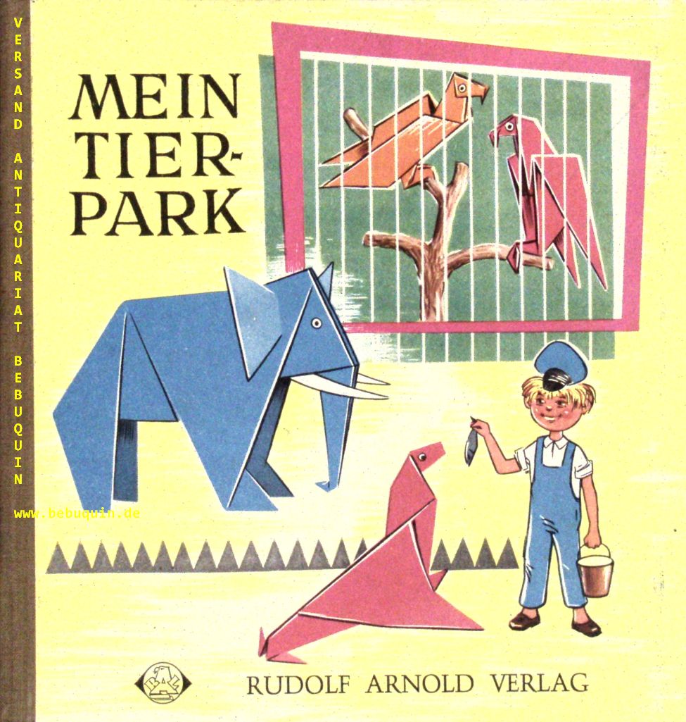 BASTELN.– LINDE, Hans: Mein Tierpark. Die Verse von Gertrud Neumann-Hechler. Leipzig (Arnold), 1964. Gr. 8°. 16 S. mit zahlr. farb. Abb. mit Text + 16 S. Beilage mit zahlr. Abb. farb. ill. OHLn. kaum bestaubt. EA.