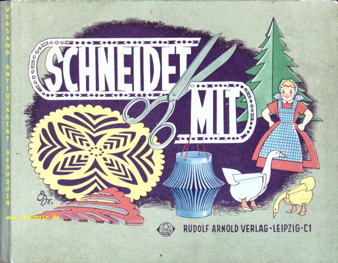 BASTELN.– SCHUMANN, Gerta: Schneidet mit. Eine methodische Anleitung f. d. Umgang mit Papier u. Schere. Leipzig (Arnold), 1956. Quer 4°. 36 S. mit zahlr. bunten Bildern. farb. ill. OHLn. kaum bestaubt. EA.