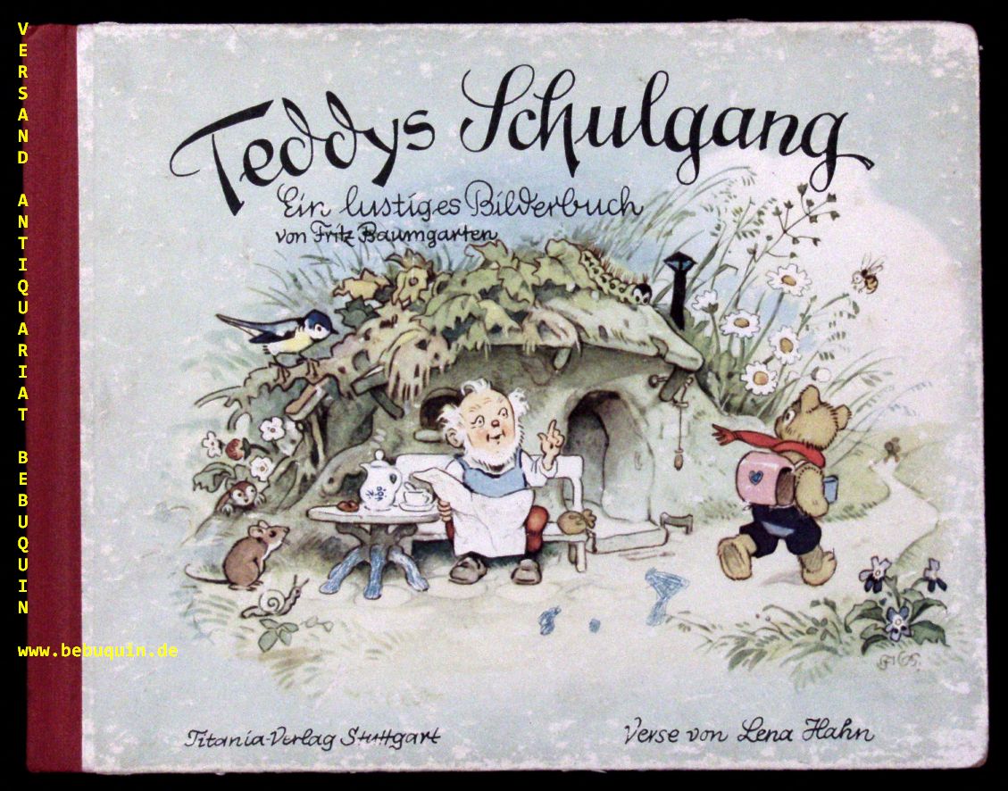 BAUMGARTEN.– HAHN, Lena: Teddys Schulgang. Stuttgart (Titania), (1954). Quer 4°. 12 Bl. mit farb. Bildern von Fritz Baumgarten. farb. ill. OHLn. Block etwas ausgebunden, Rückdeckel bekritzelt, sonst gut. EA dieser Ausgabe „in Anlehung an den erstmals 1938 erschienenen Titel mit neu gezeichneten Bilder.“ Blaume 242.