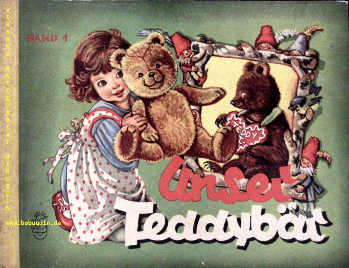 BARAVALLE, Hilde von: Unser Teddybär. Wien (Welser), ca 1950. Quer Gr. 8°. 18 S. mit teils farbigen Zeichnungen von Rosl Warzilek. farb. ill. OHLn. leicht fleckig und gelockert, insgesamt gut. = Teddy im Märchenreich, Bd. 1. EA vor der Scholz Ausgabe. Innen linksseitig sind Schwarzweißbilder zum Ausmalen, rechts farbige Zeichnungen. (vergl. Mück 6502.)