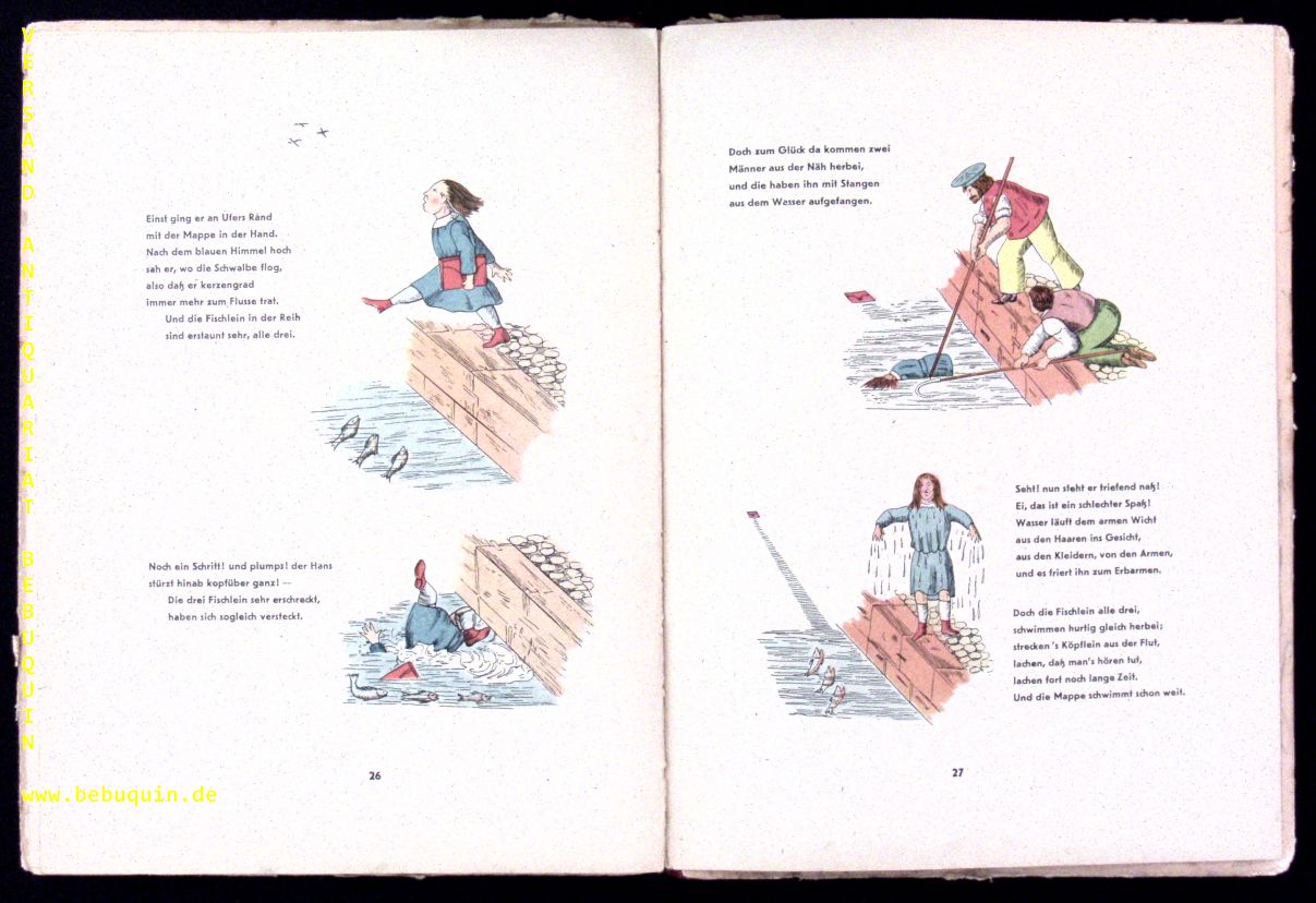 STRUWWELPETER.– HOFFMANN, Heinrich: Der Struwwelpeter oder lustige Geschichten und drollige Bilder. 1845 – 1945. Hundert-Jahr-Ausgabe. Leipzig (Volk und Buch), (1946). 4°. 28 S. mit farb. Bildern. OHLn. Einband und Titelgestaltung von Hana Unbehaun. Einband angeschmutzt, wenig gelockert. 1. und einzige Aufl. dieser Ausgabe. Rühle 61.