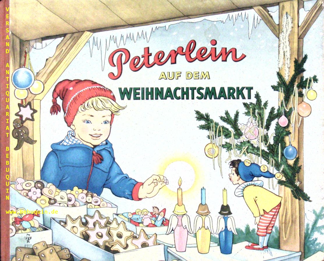 UMLAUF-LAMATSCH, Anneliese: Peterlein auf dem Weihnachtsmarkt. Ein Bilderbuch von Felicitas Kuhn. Fürth (Pestalozzi), 1965. Quer 4°. 8 Bl. mit farb. Bildern und farb. gestalteten Vorsatzpapieren. farb. ill. OHLn mit dem weiß gepunkteten Rücken. gutes Ex. = Verlagsnummer 69/1. Seltenes und gesuchtes Bilderbuch.