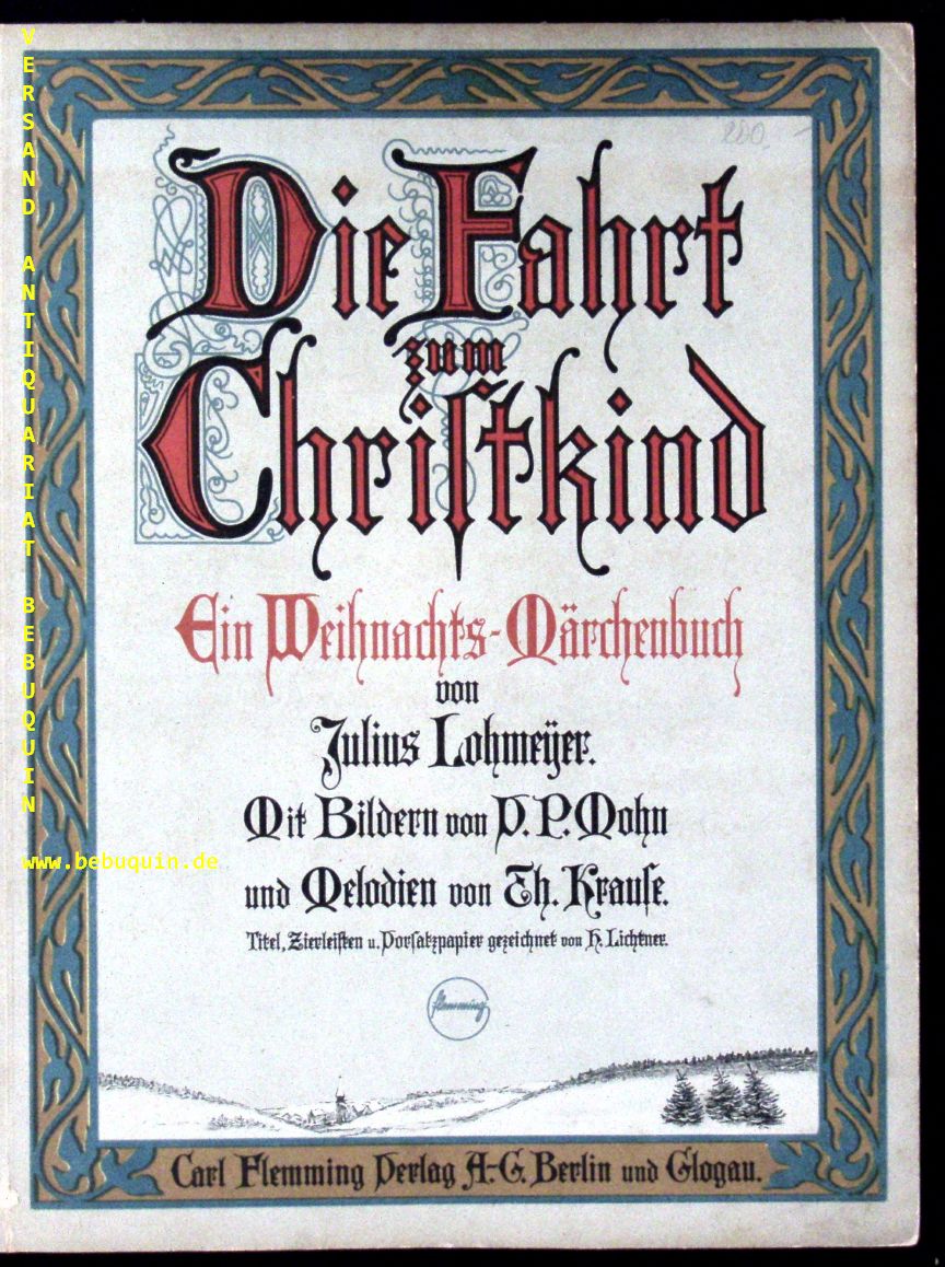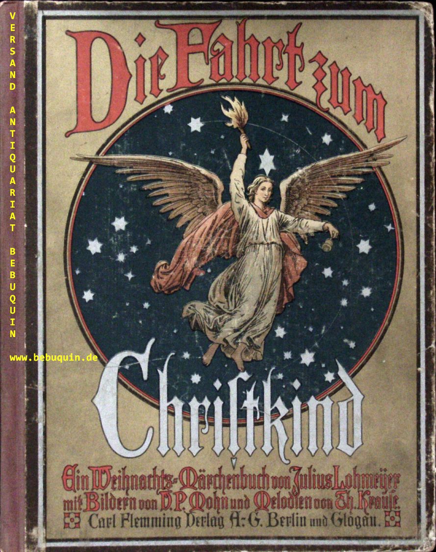 LOHMEYER, Julius: Die Fahrt zum Christkind. Ein Weihnachts-Märchenbuch. Berlin, Glogau (Flemming), (1889). Gr. 4°. 48 S. mit farb. Bildern von V.P. Mohn, Melodien von Th. Krause und Titel, Zierleisten und Vorsatzpapier von H. Lichtner. farb. ill. OHLn. Deckel mit leichten Kratzspuren, vorderes Gelenk ausgebrochen, sonst feines Ex. EA. Wegehaupt 2031.