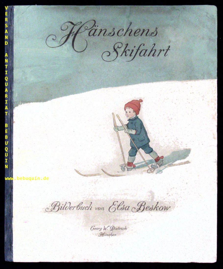 BESKOW, Elsa: Hänschens Skifahrt. Bilderbuch. München (Dietrich), (1908). 31 x 25 cm. 15 Bl. mit zahl. Textabb. + 15 (davon 13 ganzseitigen) farblithogr. Bildern. farb. ill. OHLn. teils etwas angeschmutzt und am letzten Blatt randverstärkt, insgesamt aber sehr ordentlich bis gut. seltene dt. EA. Schug 2828; Ries 3; laut Thomi: „Es dürfte sich um die wahre erste deutsche Auflage dieses Titels handeln, gegenüber der üblicherweise im Handel anzutreffenden etwas kleineren Ausgabe (21 x 29 cm). Hier ist die Verlagsangabe auf dem Einband in kursiver Schrift, die Vorsätze sind illustriert, die S/W-Zeichnungen sind teilweise leicht abweichend, Schrift und Bild sind hier etwas feiner gedruckt.“