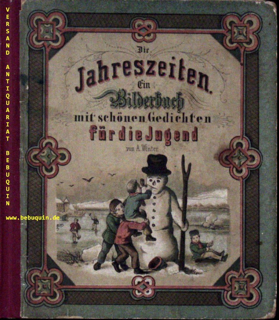 WINTER, A.: Die Jahreszeiten. Ein Bilderbuch mit schönen Gedichten für die Jugend. Wesel (Bagel), ca 1870. 14 Bl. mit 12 farblithogr. Bildtafeln. farb. ill. OPb mit neuem Leinenrücken. Kanten mit geringen Läsuren, sonst überraschend gut erhalten. EA. Bibliographisch von mir nicht ermittelt.