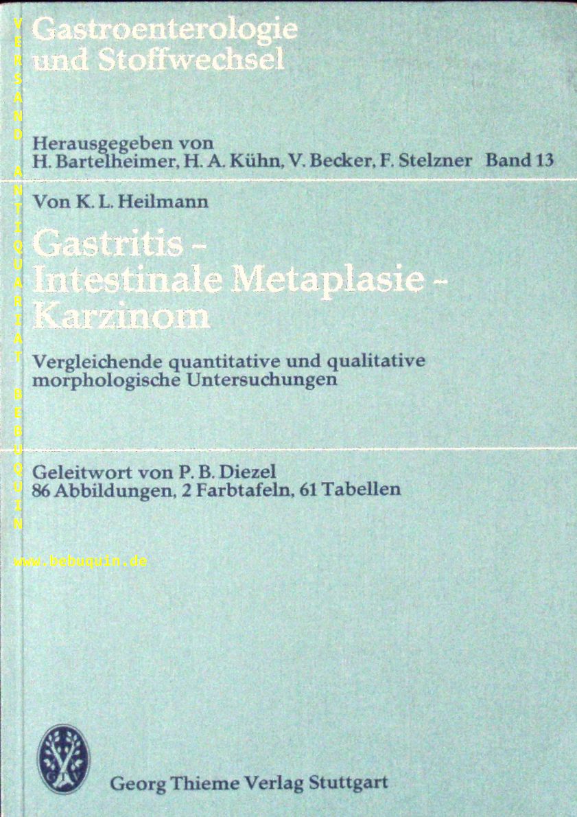 MEDIZIN.– HEILMANN, Konrad: Gastritis, intestinale Metaplasie, Karzinom. Vergleichende quantitative u. qualitative morphologische Untersuchuingen. Stuttgart (Thieme), 1978. Gr. 8°. X, 114 S. mit 88 teils farb. Abb. OKart. = Gastroenterologie und Stoffwechsel, Bd. 13. EA mit einer persönlichen signierten Widmung des Verfassers sowie ein eigenhändiger Brief desselben inliegend.