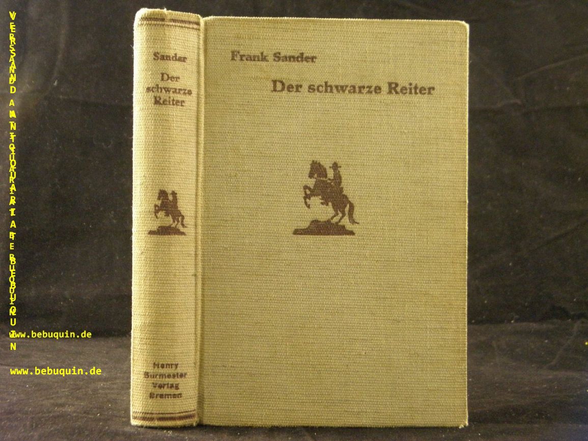 SANDER, Frank: Der schwarze Reiter. Bremen (Henry Burmester), 1935. 254 (2) S. ill. OLn. gestempeltes Leihbuch, etwas gelockert. = Burmester’s Abenteuer – Serie. EA. Frank Sander hieß in Wirklichkeit Otto Neitsch und war Berliner Senator. Geboren 1892 in Eckernförde, Vater dreier Söhne und gestorben 1941 in Berlin.