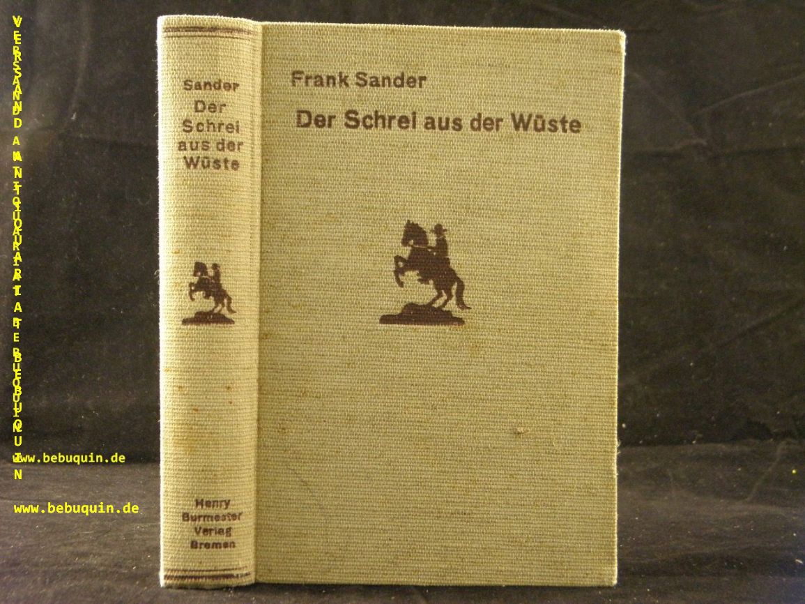SANDER, Frank: Der Schrei aus der Wüste. Bremen (Henry Burmester), 1935. 253 (3) S. ill. OLn. gutes Ex. = Burmester’s Abenteuer – Serie. EA. Frank Sander hieß in Wirklichkeit Otto Neitsch und war Berliner Senator. Geboren 1892 in Eckernförde, Vater dreier Söhne und gestorben 1941 in Berlin.