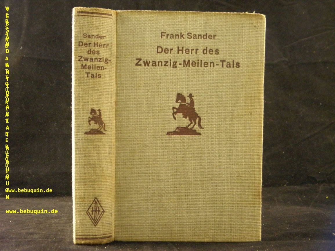 SANDER, Frank: Der Herr des Zwanzig-Meilen-Tales. Bremen (Henry Burmester), 1935. 256 S. ill. OLn. Vorsätze mit Kleberesten, NaT. = Burmester’s Abenteuer – Serie. EA. Frank Sander hieß in Wirklichkeit Otto Neitsch und war Berliner Senator. Geboren 1892 in Eckernförde, Vater dreier Söhne und gestorben 1941 in Berlin.